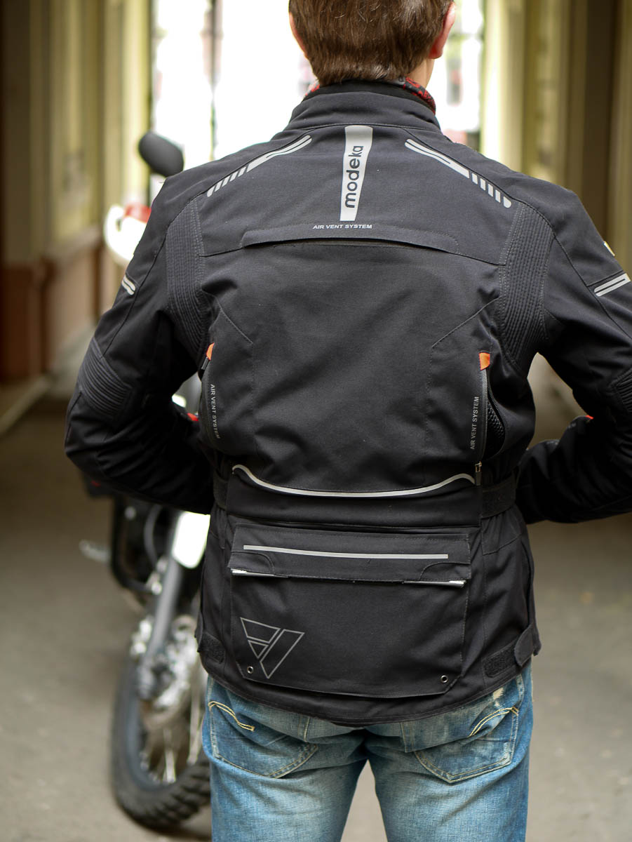 Modeka zawsze dba o bezpieczeństwo a i ja – przyznam się szczerze – jestem strachliwy i bardzo się cieszę gdy mam zapewnioną ochronę. Tacoma nie oszczędza na ochraniaczach i znajdziemy w niej wszystko co być powinno. Pełen zestaw certyfikowanych ochraniaczy Sas-Tec na łokciach, na barkach i na plecach. Do tego bezpiecznie szwy i wstawki z materiału odblaskowego 3M-Scotchlite