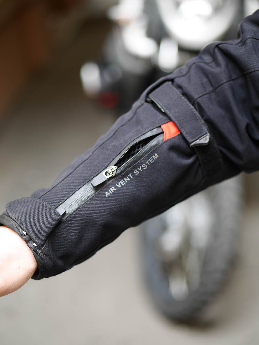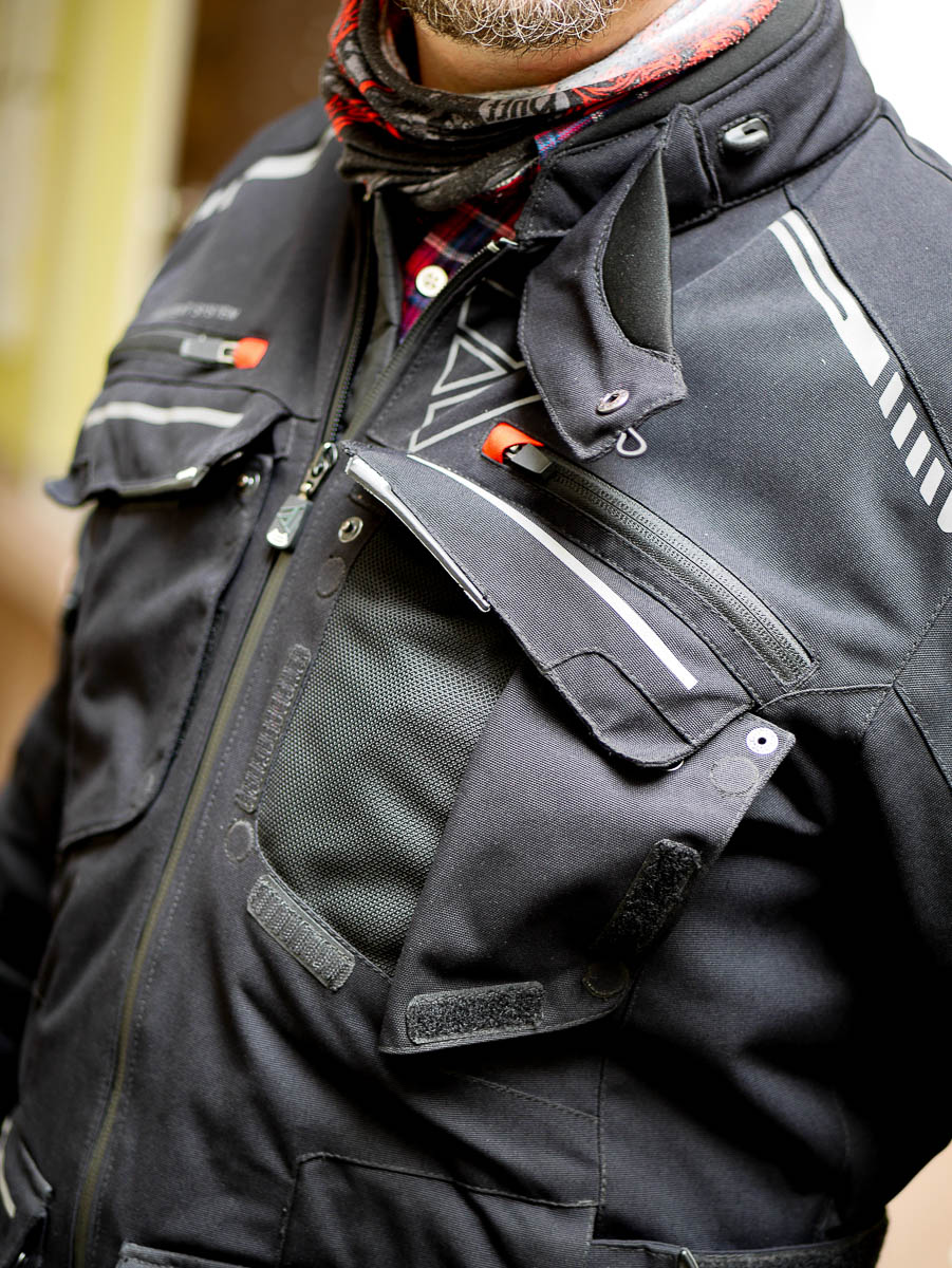 Skoro jesteśmy przy upałach to warto wspomnieć o wentylacji. Tu jakiś wielkich niespodzianek nie ma. Duże wloty na klatce piersiowej, suwaki otwierające wloty powietrza na przedramionach, z tyłu po bokach, duży suwak na wysokości karku. Generalnie jak się wszystko podpina to powierzę z przodu wlatuje a z tyłu wylatuję. Czyli tak jak być powinno. I bardzo dobrze.