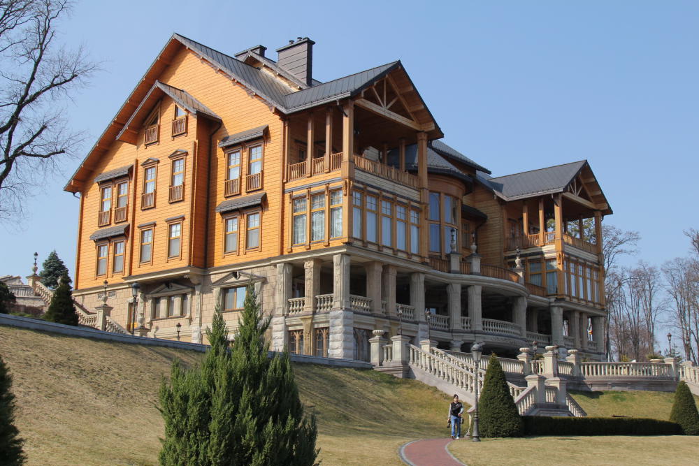 Ciekawa jest też aktualna sytuacja tego miejsca, poprzedni najemca siedzi na wygnaniu, teren niby państwowy, ale państwo się tym, podobno, nie zajmuje. Obsługuje nas samozwańczy kustosz, westalka tego miejsca, owinięty we flagę banderowca. Przybył tu prosto z Majdanu, by willę ratować przed spustoszeniem i po prostu został. Mieszka tu wraz ze swoją i dwoma innymi rodzinami, zajmując się tym miejscem. Rzec by postawa godna misjonarza. Sprzedaje bilety a dochód przeznacza na utrzymanie posiadłości. Inna sprawa, że na terenie posesji pracuje bardzo dużo ludzi, zapewniając idealny stan utrzymania posiadłości, ciężko sobie wyobrazić, ze starcza środków z biletów! Nawet Milicja tu pilnuje, ale pan przewodnik twierdzi, że nikt poza nim nie chce się tym zająć. Widać lekkie zmieszanie i nerwowość jak nasza wesoła, dociekliwa gromadka zadaje trudne pytania, ale może to tylko dziwne dla człowieka zachodu, a tutaj to normalne. W końcu spotkaliśmy patriotę, bohatera z Majdanu.