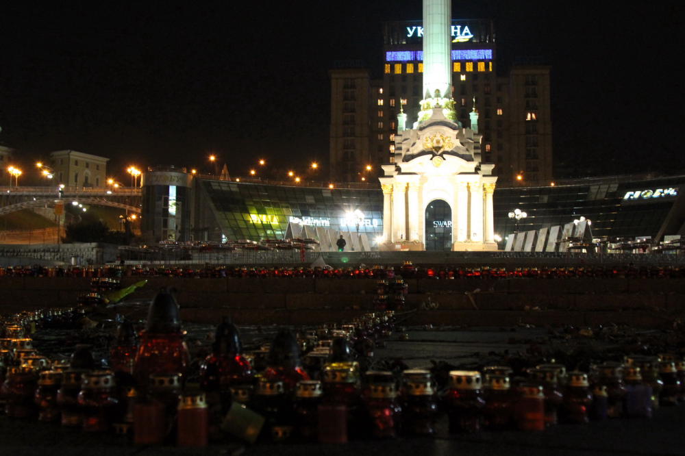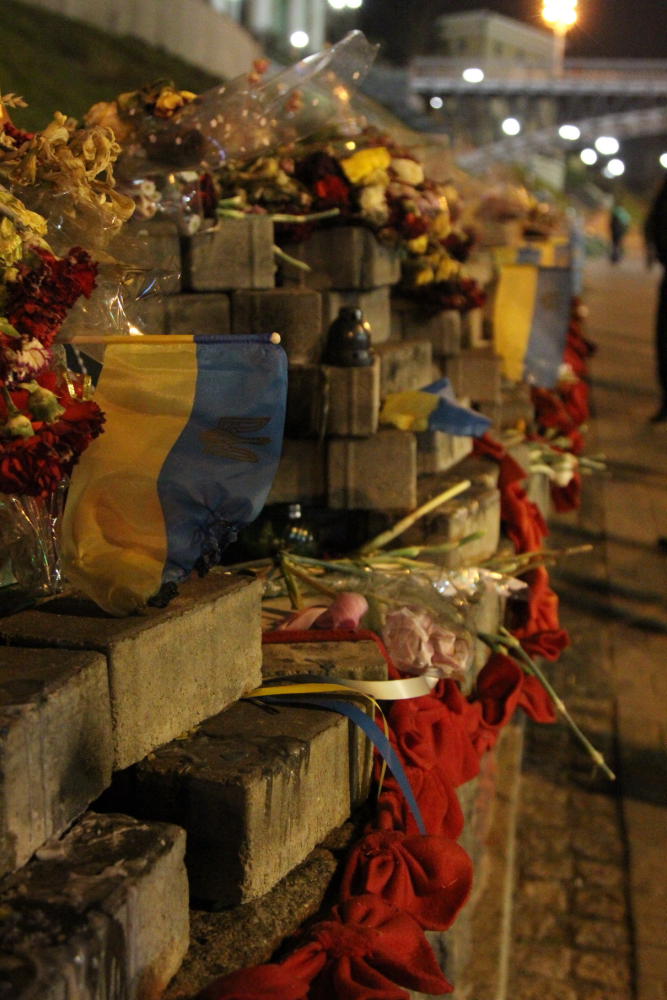 Rok temu takiej dojrzałej zmianie uległ naród Ukraiński. Trochę z przypadku, trochę od niechcenia, trochę bez wyraźnego planu, spontanicznie i nastało pospolite wzburzenie. Powstał Majdan, którego atmosfera narastała, gęstniała i podlegała różnym fluktuacjom. Stając dzisiaj na Majdanie, z człowiekiem, który uczestniczył w tych wydarzeniach, który również z przypadku, spontanicznie, trwał, był…… doświadcza się zupełnie innego uczucia. Nie można przejść obojętnie, odwrócić się na pięcie czy odejść; powiedzieć, właściwie co mnie to obchodzi…… Nie, nie da się, może gdybym była jednym z wielu przechodniów, ale już nie mogę, bo przy tej opowieści otwiera się uszy i chłonie umysłem, a jej słowa wiodą nas do innego wymiaru. Trochę nierzeczywistego, trochę dla nas przypominające lata osiemdziesiąte i czas wielkich zmian dla Polski. Słowa pełne emocji dalej płyną z ust mówcy, wkoło znicze poukładane w herbie Ukrainy, mnóstwo kwiatów, w tle hotel Ukraina, a przed nim supermarket z neonami marek luksusowych. Daleko w tle, między jednym miejscem barykady a drugim, majaczy murek, na którym hołd oddajemy poległym bohaterom, tym sprzed roku…,