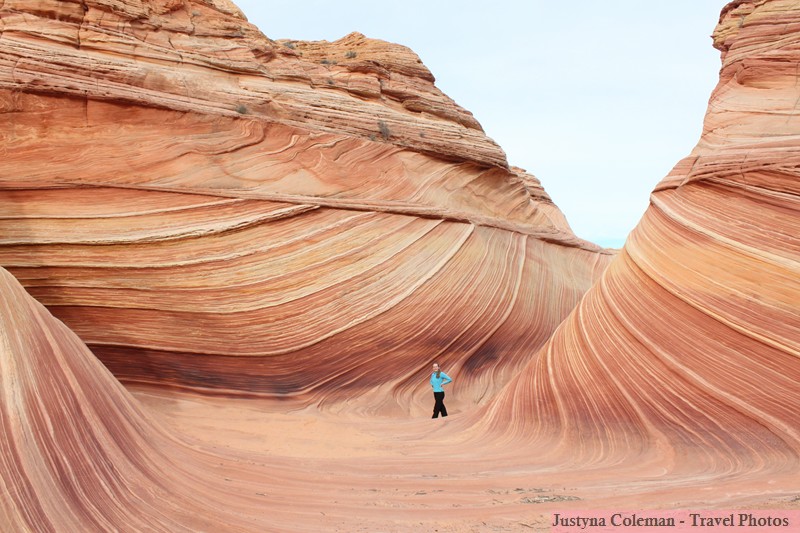 Jednym z najciekawszych i najbardziej niezapomnianych miejsc z całej podróży była tzw. Fala (ang. The Wave) na terenie rezerwatu Coyote Buttes North, który znajduje się na terenie Vermillion Cliffs National Monument w Arizonie i Utah. Miejsce to było uwiecznione na okładkach albumów muzycznych m.in. Pink Floyd. Jest to niezwykła, naturalna formacja skalna wyżłobiona przez wiatr i wodę w wielokolorowym piaskowcu, kształtem przypominająca zaklętą w czasie piaskową falę. Aby tam się dostać należy wziąć udział w loterii i wylosować jedną z 20 wejściówek. Taką formę wydawania biletów wprowadzono, ponieważ jest wielu chętnych, a Fala jest niezwykle delikatną formą skalną łatwo ulegającą degradacji. Loteria odbywa się przez internet (tak rozdawana jest połowa biletów dziennie) oraz w biurze BLM (ang. Bureau of Land Management, czyli Urząd Zarządzania Terenami) w Kanab w stanie Utah. Mieliśmy szczęście pojawić się tam w zimowy poranek 21 stycznia 2014, w który to, ze względu na off-season, w loterii typu bingo (no, bo przecież to Ameryka) brało udział tylko 13 osób. Szanse na wygraną były więc całkiem spore. Następnego dnia rano odwiedziliśmy słynną Falę. Wow! Co za miejsce! Naprawdę warto było wziąć udział w loterii.