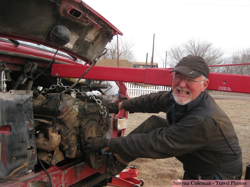 Jak się okazało następnego dnia, po dokładnym umyciu podwozia, podczas najsilniejszego z uderzeń przednia oś pojazdu uderzyła w filtr oleju, z którego wyciekł olej i tak silnik pozbawiony oleju zatarł się… Co tu zrobić- sprzedać wana na złom lub wymienić silnik. Wybraliśmy drugą opcję, a ponieważ mieliśmy bardzo gościnnych i pomocnych znajomych, którzy pozwolili nam skorzystać z ich narzędzi, sami zabraliśmy się do roboty. I tak właśnie, tylko we dwoje, wymieniliśmy silnik Chevy 350. Zajęło nam to, co prawda, cały miesiąc, ale w końcu byliśmy znowu na drodze. Po takim doświadczeniu nic nie wydaje nam się niemożliwe J I marzymy o kolejnej podróży na zachód!