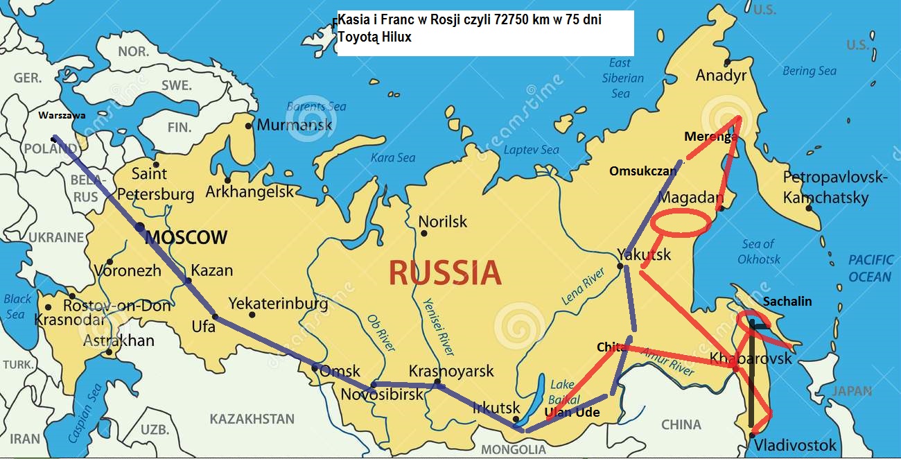 Bohaterowie naszego spotkania w trzy miesiące pokonali 72 tyś kilometrów: 7 tyś km bocznymi drogami Jakucji i Kołymy, 1500 km drogami potajfunowymi na Primoriu i przeszło 700 km trasami terenowymi na Sachalinie. Tak, tak… na tym Sachalinie, który leży nieopodal Japonii.